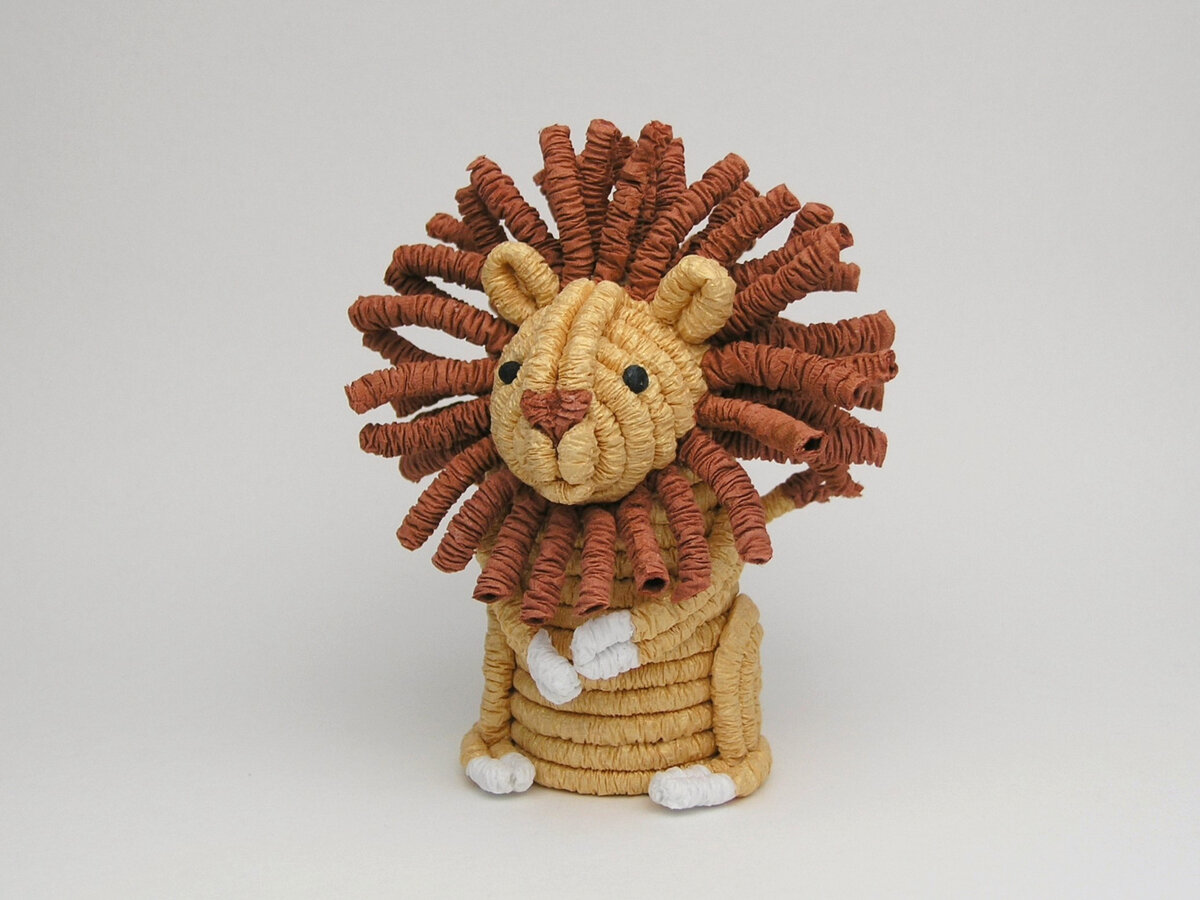 Львиная грива пышна и красива. Умна голова у нашего льва. Лев величав. Лев всегда прав! Умненького львёнка сделаем из 14 гофротрубочек бежевого цвета и 10 коричневых. Ещё понадобится одна белая гофротрубочка, картонная втулка из под фольги, две салфетки и два квадратика чёрной гофробумаги. Как крутить гофротрубочки, можно посмотреть здесь. Туловище львёнка сделаем из картонной втулки диаметром 3 см. Срежем её под наклоном. С одной стороны высота 5 см, с другой - 6 см. Сделаем львёнку голову. Одну салфетку сомнём в комочек, придадим комочку овальную форму и обернём его другой салфеткой. Всё зафиксируем клеем. Приклеим голову к туловищу. Начнём оклеивать туловище трубочками снизу. Спереди верхнюю трубочку немного сожмём. Оклеим голову. Начнём с середины. По бокам удобно приклеивать одинарные трубочки. Голова готова. Подготовим мелкие детали для мордочки. Ушки сложим из одинарных отрезков. Глазки-бусинки скатаем из чёрных квадратиков. Коричневый отрезочек для носа сожмём с одного края с