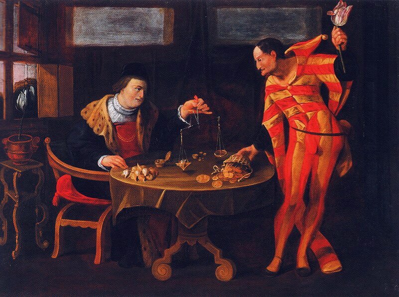 Начиная с 1593 года до 1637 в Голландии произошёл ажиотаж на луковицы тюльпанов. Стоимость доходила до фантастических высот. Одна луковица могла стоить 1000 гульденов. Когда средний годовой доход любого голландца на тот момент был всего 150 гульденов. То есть цены были не реально возвышенными. Например, купить триста свиней стоило - 300 гульденов, а тут одна луковица 1000. Самые редки луковицы могли доходить и до 6 тысяч гульденов за такую цену можно было купить и дом с хозяйством. А как все просто начиналось. В середине XVI века в Европу были привезены тюльпаны. В 1593 в Голландии были высажены первые тюльпаны и это событие изменило историю страны на годы вперед. Когда местные жители увидели впервые тюльпаны они были поражены их красотой и просили им их продать. Но когда им было отказано, голландцы пробрались под покровом ночи и выкрали луковицы тюльпанов. Так тюльпаны стали распространяться по Голландии. На тот момент ещё не знали, что лепестки тюльпанов могли менять свой рисунок и