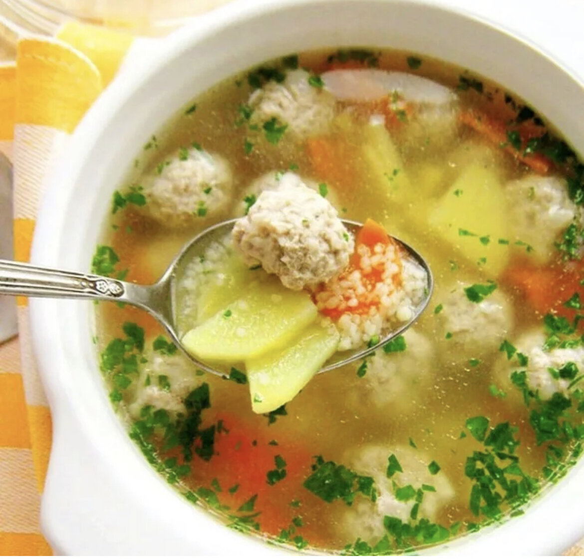 на 100 грамм 41.28 Ккал Б / Ж / У : 1.78 / 1.53 / 5.18 Ингредиенты : Мясной фарш 200 гр Морковь 100 гр Картофель 300 гр Рис 100 гр Зелёный лук 40 гр Лавровый лист Соль, перец по вкусу В кипящую воду кладём натертую на крупной терке морковь и порезанный произвольно картофель. Из фарша формируем фрикадельки. Когда картофель будет наполовину готов, закладываем фрикадельки, добавляем лавровый лист, солим, перчим. За пару минут до готовности супа добавляем мелконарезанный зелёный лук. Приятного аппетита! Если понравился рецепт, ставьте лайк и подписывайтесь на канал. Будьте здоровы и красивы!