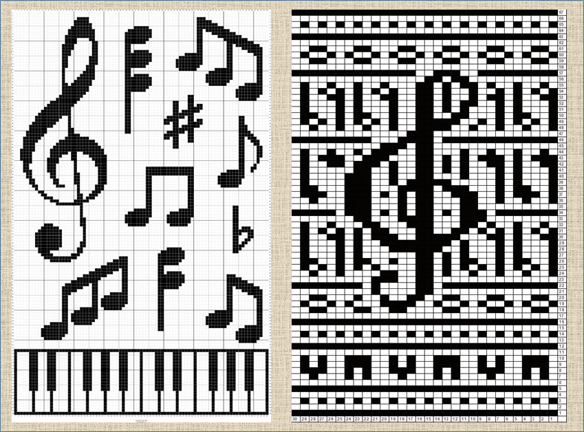 Сегодня в подборке конечно же снова жаккард, схемы с нотами, скрипичными ключами и прочей музыкальной атрибутикой. Можно использовать эти схемы не только для вязания полотна спицами, вышивки или филейного вязания крючком. Кстати, как рисовать схемы жаккарда можно почитать тут: тык , а посмотреть тут: тык Всем удачи и творческих успехов. Спасибо тем, кто дочитал до конца. Буду очень рада вашим лайкам и подписке. Приглашаю всех в мою рукодельную группу в ВК, где я публикую много всего полезного и интересного, вот ссылка: ВК