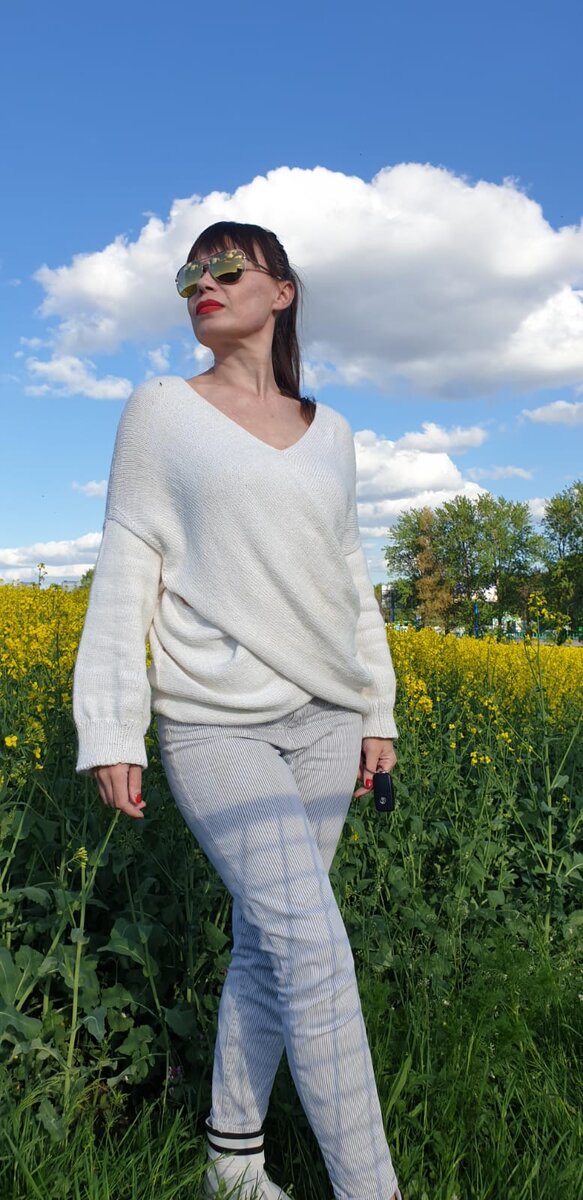 Для начала я скажу, что я вяжу только руками. В данном изделии использовались спицы. Пряжа: меринос бобинный (2400м/100гр) в пять сложений молочный и хлопок бобинный в 4 сложения белоснежный. Я вяжу максимально без швов. Начала со спинки. На размер 42-46 набрала 120 петель. Резинка 1х1 9 см на спицы 2,5. Последний ряд резинки провязала спицами 4,0 и далее использовала их. От резинки вверх лицевой гладью 28 см. Каждый 12 ряд прибавила по одной петле с двух сторон. Далее прямо 19 см , без всяких изменений. И мы пришли к началу вывязывания скошенного плеча. Я его вяжу так: это укороченные ряды, в который каждый раз я не довязываю по 10 петель, при такой толщине нити. Симметрично с обеих сторон. В данном изделии я не вывязывала вырез горловины, оставив на неё 30 петель. Т.е вяжу укороченными ряды до тех пор, пока не останется 30 петель. Делаю пару рядов все петли вместе, чтобы не было дырок в местах разворота укороченных рядов. Петли горловины я закрываю любым эластичные способом,
