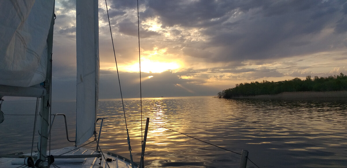 00-20 проснулся, как обычно, думки, адреналин...А что если? А если вот так? Или так? Проворочался потом час, и так и не уснул, в 1-20 поставил чайник греться, да и подогреть каюту надо, все же спальник пока не лишний...подогрелся, разморило, лег спать разбудил будильник 3-00. По прогнозу в это время ветер не сильный. Не будет ветра, так и помоторю по штилю. Подьем, умылся, оделся, выпил воды и вперед! 3 50 отчалил, Поставил паруса и... ветра почти нет. И он не оттуда, чистый мордотык с северо востока...Ну и ладно, такой вариант тоже входил в расчеты, убрал паруса и пошел моторить, курс на Карамалку, бензака 3 литра, до туда точно хватит, цель перейти водохранилище, так как оно не прогрето и долбит своим северным ветром, возле суши, на другом берегу, должен уже южняк быть. В 5 утра вышел на большую воду, подмерз и решил подрейфовать, яишенка с макарохами, чай , вот теперь хоть сутки можно рулить! 9-50 Карамалка на траверзе, на водохранилище штиль, ушел к берегу, встал на якорь ждать ве