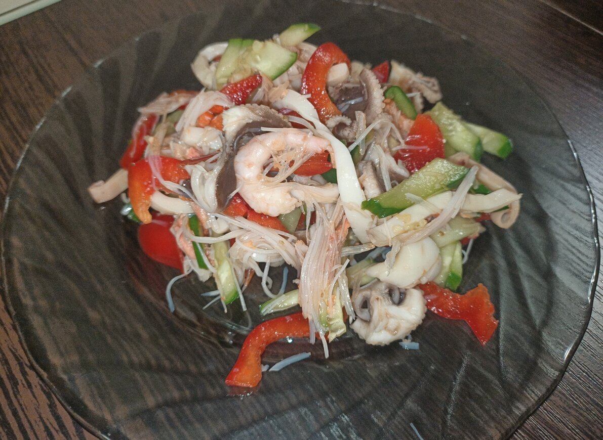 Вашему вниманию представляю салат из ценнейших морепродуктов с овощами и вкусным соусом. Для салата нам понадобятся: - кальмар тушка – 3-4шт - креветки – 200гр - крабовые палочки (крабовое мясо) – 200-250гр - осьминоги (каракатицы) – 200гр - огурец – 1шт - перец болгарский – 1шт Приправы: - кориандр молотый – 1ч.л. - чеснок – 1-2 зубчика - соевый соус для заправки – 4ст.л. - соль по вкусу - гвоздика – 1шт - лавровый лист – 1шт - перец горошком – 2шт Подготовка: 1. Свежемороженые тушки кальмара предварительно размораживаем. Способ 1 чистки кальмара: на разделочной доске чистим от пленки, разрезаем тушку со стороны брюшка и извлекаем внутренности и тонкую хитиновую пластинку. Промываем. Откидываем на дуршлаг. Способ 2: берем глубокую миску, перекладываем в нее размороженные кальмары. Заливаем на 1 минуту крутым кипятком. Воду сливаем. Заливаем холодной водой на 1 минуту. Сливаем воду. Отделяем пленку от тушки. Из-за разности температур пленка съежится и легко снимется. 2. Затем очищенные