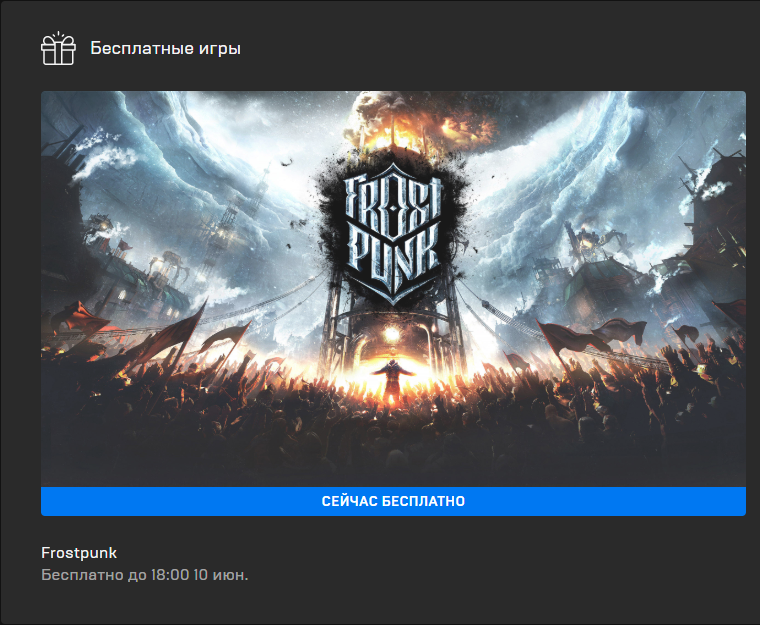 Ну привет сейчас я расскажу про несколько игр steam и не steam. Frostpunk Первая игра которую мы заберём это Frostpunk в EpicGames на распродаже.Просто регистрируемся и забираем в библиотеку. Игра так себе,но пойдёт для библиотеке Warhammer Underworlds: Online Эта игра уже бесплатно раздаётся в steam.Если эта игра вам понравится то играйте. Берите на здоровье! Minion Masters: Scrat Infestation Платное DLC уже бесплатно для игры Minion Masters в steam.Забирай быстрей! На этом всё и да эти игры я нашёл на ютубе, по этому сам я их не искал,а только собрал.Ютуберы не бейте Мой steam: https://steamcommunity.com/id/DoesntToMe/ ПОКА