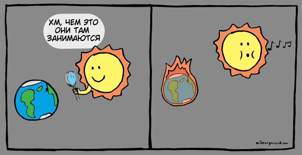 Большой привет всем любителям космического юмора, загадочных квазаров и величественных галактик. Сегодня у нас качественная подборка веселых комиксов о космических обитателях. Предлагаю не откладывать в долгий ящик и подробно рассмотреть, чем занимаются планеты на приеме у психолога, для чего нужна летающая тарелка, как расширяется вселенная и другие приколы нашей галактики. Так как было сложно найти комиксы о космосе у одного автора, пришлось собрать подборку от разных художников, которые как нельзя лучше смогли донести космическую сатиру в веселых комиксах. Канадский художник Mike Organisciak немного поразмышлял о том, чем на самом деле занимаются обитатели солнечной системы. Любопытное солнце решило внимательно рассмотреть, чем таким интересным занимаются эти люди. Комиксы серии Optipess, как всегда полны сарказма. Автор этих оптимистично-пессимистичных комиксов художник из Норвегии Кристиан Нюгард. Он настоящий киноман, любитель видеоигр и музыки. Кристиан решил немного посмеяться