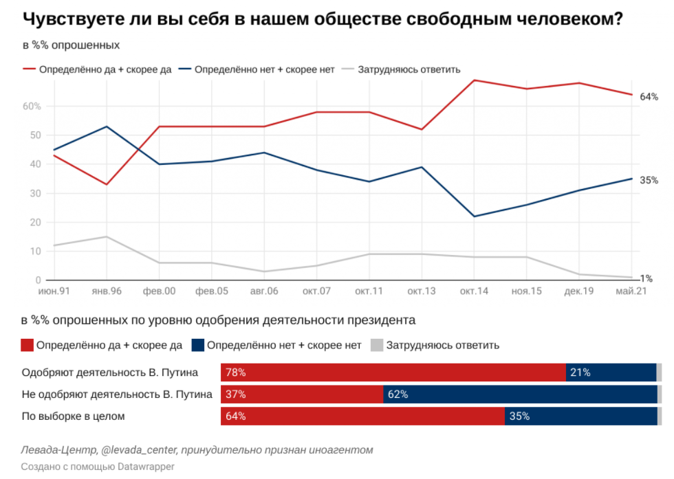 По данным из недавнего опроса, 64% россиян чувствуют себя свободными - несколько меньше, чем в пиковом 2014 году (тогда было 69%), но гораздо больше, чем 53% 2013 года. Вообще, кстати, очень интересный эффект 2014 года, когда настроения народа очень резко улучшились (видимо, эффект Олимпиады и Крыма) В целом, доля россиян, считающих себя свободными, держится на достаточно стабильном уровне последние годы, а вот доля чувствующих себя несвободными достаточно уверенно растёт за счёт снижения доли неопределившихся: с 22% в 2014 до 35% в 2021 Интересно и самоощущение людей в зависимости от отношения к деятельности Путина: среди одобряющих действующего президента свободными себя чувствуют 78%, а среди неодобряющих - только 37%