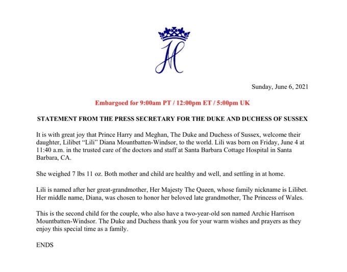 Думаю, одним из самых обсуждаемых вопросов в Сети последние пару дней были предположения - родит ли Меган Маркл второго ребенка 10 июня или нет? Совпадет ли 100 день рождения супруга королевы с рождением их правнучки? Сегодняшняя новость разрешила все споры и домыслы. Оказывается, счастливое событие в семье Сассексов случилось - причем еще несколько дней назад. В объявлении от представителя пары сообщили о том, что в пятницу 4 июня на свет появилась дочь Гарри и Меган: "С большой радостью принц Гарри и Меган, герцог и герцогиня Сассекские, приветствуют свою дочь Лилибет "Лили" Диану Маунтбеттен-Виндзор. Лили родилась в пятницу, 4 июня, в 11:40 утра под надежной опекой врачей и персонала больницы Санта-Барбара Коттедж в Санта-Барбаре, Калифорния. Вес девочки составил 7 фунтов 11 унций. И мать, и ребенок здоровы и сейчас находятся дома.