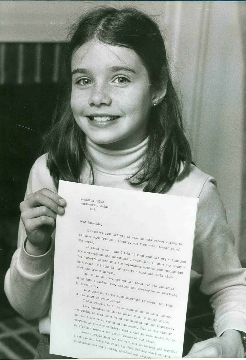 25 апреля 1983 года 10-летняя американская школьница Саманта СМИТ получила приглашение посетить Советский Союз от генерального секретаря ЦК КПСС Юрия АНДРОПОВА, прочитавшего присланное ему Самантой письмо, в котором она говорила о своей боязни ядерной войны между нашими государствами. По приглашению Андропова в ответном письме Саманта посетила в июле 1983 года Советский Союз: Москву, Ленинград и пионерский лагерь «Артек», её путешествие освещалось мировыми СМИ. После возвращения из СССР Саманта написала о поездке книгу, снималась в сериалах.