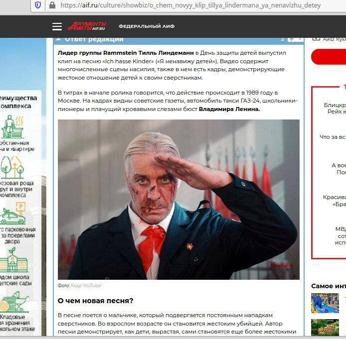 1 июня состоялся релиз нового клипа вокалиста группы "Rammstein" Тилля Линдеманна на песню "Ich hasse Kinder" (в переводе с немецкого "Ненавижу детей"). Линдеманн славится своей скандальностью, и данная работа не является чем-то удивительным. Однако, использованная в фильме атрибутика Советского Союза в купе с насилием вызвала у некоторых шквал негодования. И выглядят немного странными комментарии в интернете про ужасы ГУЛАГа и репрессии, что опять выставили Союз как империю зла, хотя по сюжету показывается худенький мальчик, которого обижают его одноклассники. Проблема детской жестокости есть ещё в "Братьях Карамазовых" Достоевского, потому неудивительно, что подобное могло встречаться и в СССР - не как повседневность, но в той или иной степени, и отрицать это было бы глупо (недаром поговорка "бьёт - значит, любит" сохранилась до наших дней, и негативные установки могли наследоваться шлейфом еще с царской Руси).