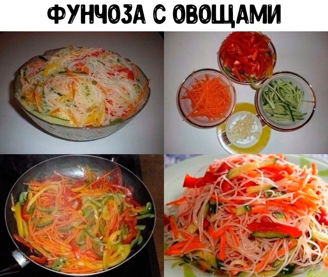 ✍Ингредиенты: 200 г лапши прозрачной рисовой 3 шт. болгарского перца разного цвета 2 моркови 3-4 зубчика чеснока масло растительное 1 огурец свежий 2 ч.л. уксуса соль соя (соевый соус) ✍Приготовление: 1. Фунчозу буквально минут на 10 надо залить холодной водой, потом всю воду слить и залить кипятком на 5 мин. и слить кипяток, промыть лапшу под проточной водой. Слить всю воду.. 2. Морковь и перец нарезать соломкой, обжарим слегка на растительном масле до мягкости. В конце добавим нарезанный чеснок. 3. Остудить овощи и смешать их с лапшой и огурцом. Добавить уксус, соль по вкусу и сою (соевый соус).