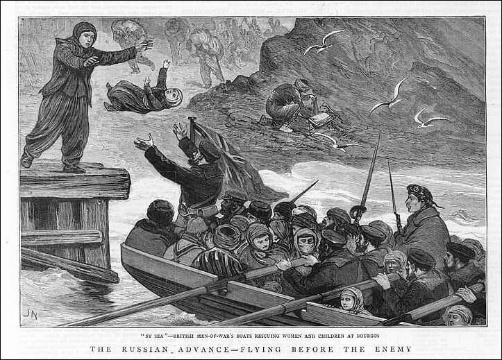 Подпись под встретившимся в интернете снимком гласит: British men-of-war's boats rescuing women and children at Burgas, flying before the enemy by sea, the Russians advance, Bulgaria, Russo-Turkish War, engraving, illustration from the magazine The Graphic, volume XVII, no 429, February 16, 1878. - Британские военные шлюпки спасают женщин и детей, бегущих по морю из болгарского Бургаса при приближении русских. Иллюстрация из британского еженедельника The Graphic от 16 февраля 1878 года.