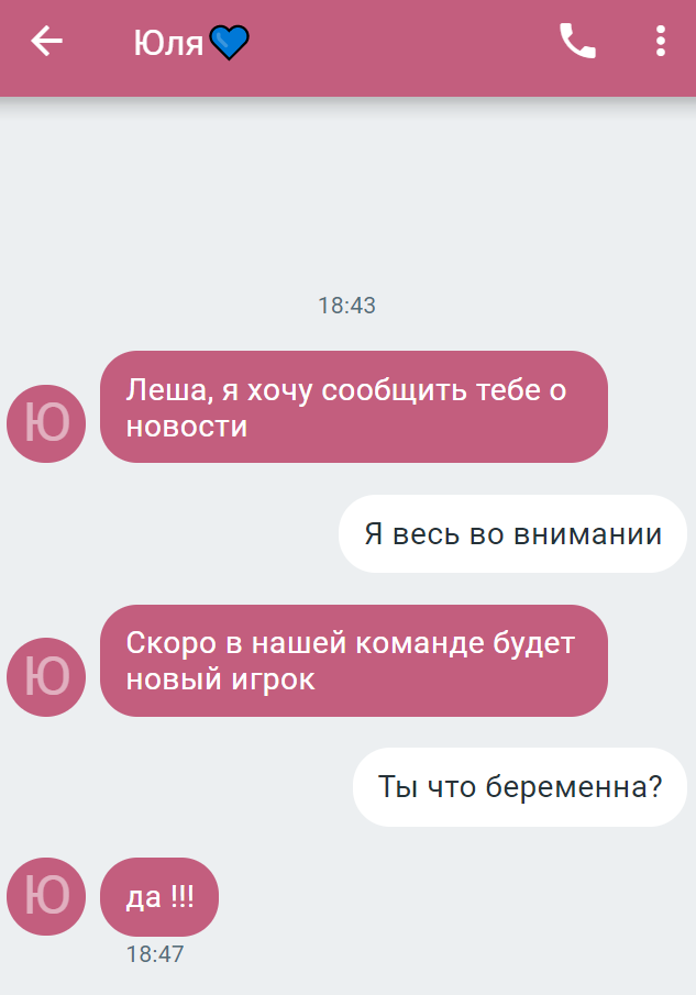 Беременность… как много в этом слове. И корень, и два суффикса, и нулевое окончание… ммм, просто загляденье😊 А что в этом слове есть для тебя, мой дорогой читатель? Конечно же, беременность – это особенный момент. Момент появления нового человека на свет. Момент начала новой судьбы… новой жизненной истории. Хотя нет, это я про роды уже🙃 Беременность, пусть будет тогда, особым моментом подготовки новой жизненной истории… да… так лучше. Но, как и у любого житейского явления у беременности есть свой особый цикл. Любая ситуация в своем составе имеет 3 акта: 1 акт – зарождение ситуации (начало) 2 акт – цикл ситуации (середина) 3 акт – завершение ситуации (конец) Подборка наших сегодняшних переписок, конечно же относится к 1 акту – к ситуации, когда девушка (женщина), узнает о том, что она беременна: Когда муж любит футбол, можно сообщить ему о приятной новости на понятном для него языке. В следующей переписке жена решила заранее позаботиться о том, как ее муж воспримет неожиданную весть:
