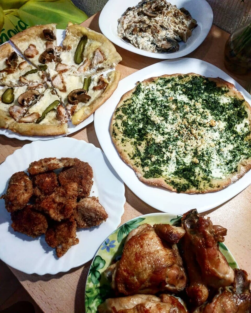 Впереди выходные - а это значит, что нужно посвятить время семье. И приготовление пищи не должно занять много времени! Делаем все только самое простое. Но не менее вкусное! Делюсь своим меню! 1. Куриные бедрышки в медово-соевом соусе Столовая ложка меда и 2 столовые ложки соевого соуса - соединяем, маринуем мяско в течение пары часов, обжариваем с двух сторон и доводим до готовности под крышкой вместе с маринадом. Вкусно! 2. Наггетсы Ну что поделать - любят мои дети эту еду. Просто нарезаем филе курицы на небольшие кусочки, обваливаем во взбитое яйцо, затем в панировочный сухарь. Обжариваем на масле с двух сторон. Вкусно! 3. Три пиццы было. Пока я готовила оставшиеся блюда, дети полностью примяли первую пиццу. Рецепт теста здесь, а начинку делаем любую. И да, стыдно признать, но сегодня я впервые готовила пиццу без противня, без формы - на силиконовом коврике! Это просто фантастика! Ничего не пригорает, не прилипает - это невероятно! Начинки для детей: 1. Пицца с колбасами и помид