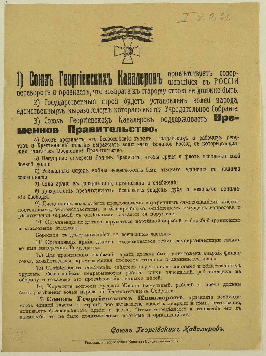 "Союз георгиевских кавалеров приветствует совершившийся в России ПЕРЕВОРОТ".