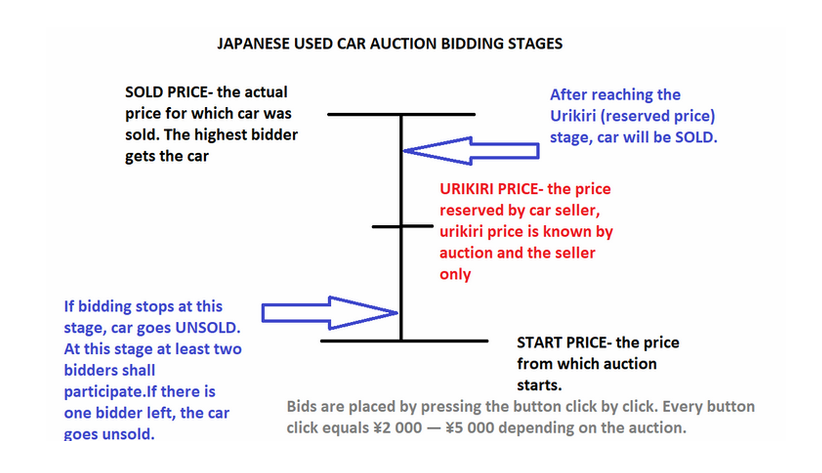 https://www.akebono-akb.com/post/two-stages-of-auction-bidding-akebono Often we have to explain why, when our client has a bid of, for example, 100,000 yen, the car leaves not sold at auction, for example, for 60,000 yen, and how then this car can be redeemed. All trades (except for “urikiri trades” - trades without a reserved price) are divided into two stages: 1) Bidding before the reserved price (before"urikiri") and 2) Bidding after the reserved price is reached (After "urikiri" opened). The reserved price of a car is known only by the auction system, which controls the bidding and the car seller. Likewise, the seller himself can control the sale process and press the “urikiri” (reserved price) button when he decides that he is ready to sell the car at the current price. We, the buyers, know that the auction has reached the reserved price for the illuminated “売 切 り” (urikiri) light and we understand that the car will definitely be sold to the one who presses the joystick last. If