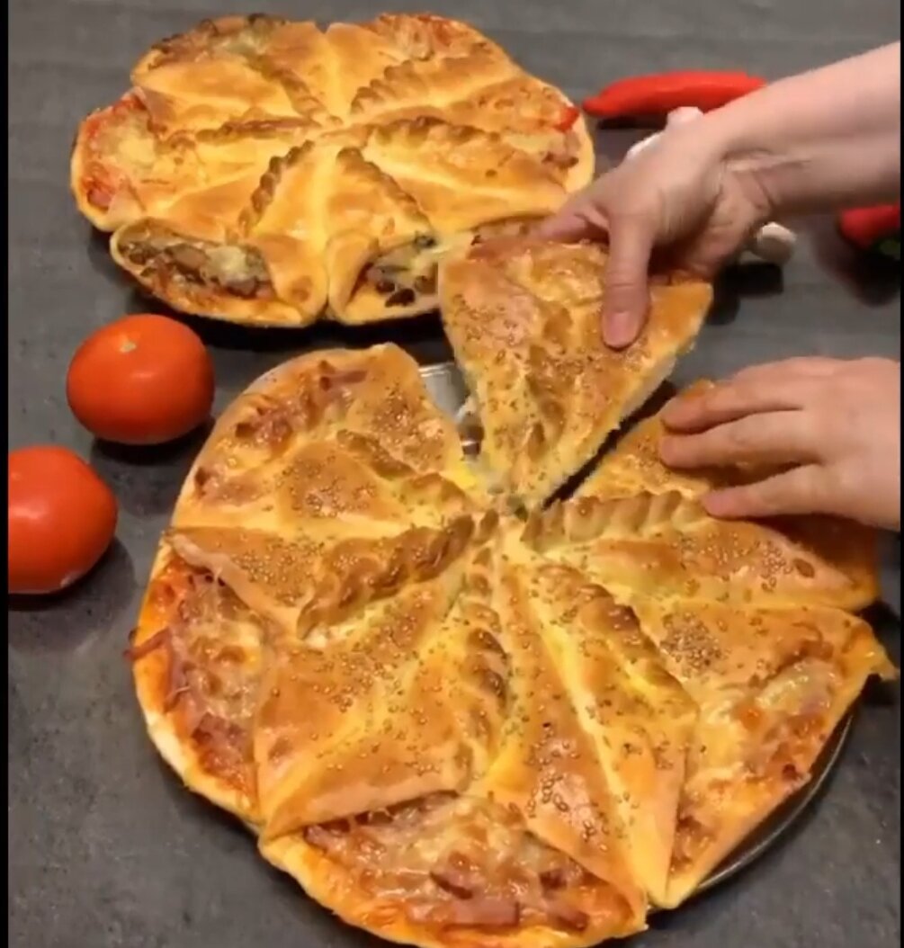 Ингредиенты: Для теста: 🍕молоко -300 мл 🍕 соль - 1 ч.л 🍕 сахар -1 ст.л 🍕 дрожжи -11 г 🍕 мука - 500 +/- г 🍕 раст.масло -4 ст.л (Из этого теста получаются 2 пирога). 🍕 для начинки можно использовать всё что вы хотите, вся прелесть в этом рецепте, что можно начинять каждый кусочек по разному, кто как любит. Приготовление: Молоко должно быть тёплым или комнатной температуры, сначала смешиваем все ингредиенты кроме муки, хорошенько перемешиваем и замешиваем добавляя муки мягкое тесто. Ставим в тёплое место и даём подниматься примерно на полтора часа. Затем делим на 12-14 частей тесто и собираем КАК пирого-пиццу. Смазываем желтком, посыпаем кунжутными семечками и отправляем в раскалённую духовку при 180-200 град., примерно на 25-30 минут. Всем приятного аппетита!