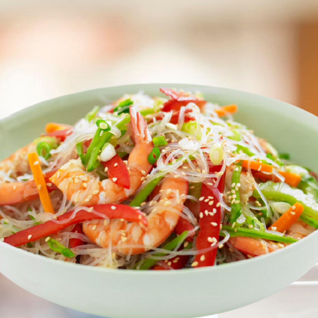 Ингредиенты: Креветки -100гр Фунчоза - 100гр Болгарский перец -1шт Морковь-1 шт Огурец -1шт Для соуса: Соевый соус-2ст.л Чеснок -2 зубчика Мёд -1ст.л Лимонный сок-1ст.л Приготовление: 1. Размораживаем креветки, очищаем. 2. Отвариваем фунчозу 3. Нарезаем овощи соломкой 2. Сливаем воду с фунчозы и промываем холодной водой 3. Пассируем морковь с болгарским перцем 4. Смешиваем все ингредиенты для соуса, чеснок измельчаем 5. Добавляем креветки к овощам и обжариваем 5-7 минут 6. Выкладываем фунчозу, огурец и соус 7. Все перемешиваем, солим по вкусу и готово. Приятного аппетита!
