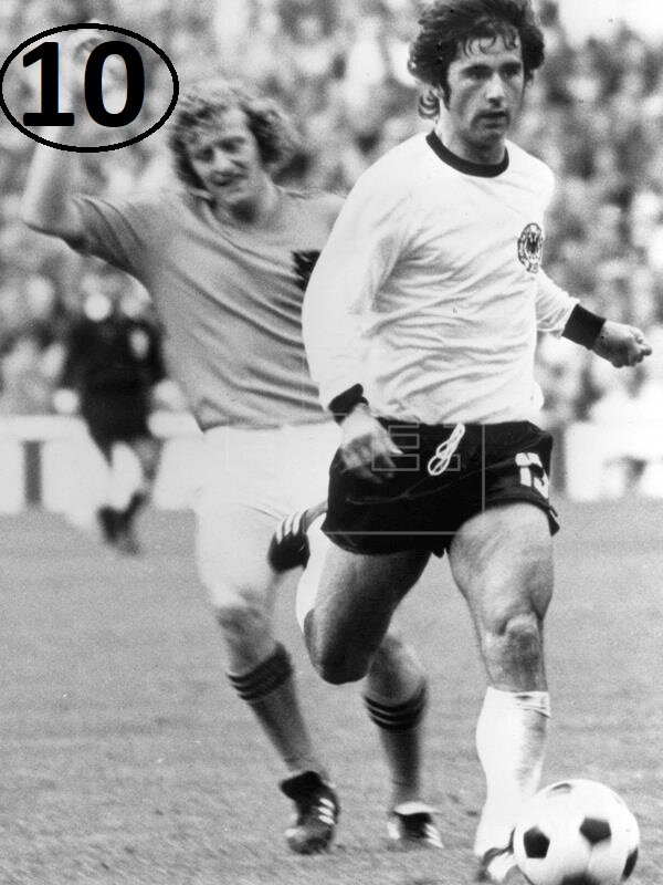 10. Герд Мюллер Мюллер является западногерманским футболистом, игравший за мюнхенскую «Баварию» и за сборную ФРГ. Он считается за всю историю футбола одним из лучших бомбардиров, а также представляется трехкратным обладателем Кубка европейских чемпионов. В составе «Баварии» игрок обрел практически все возможные трофеи периода 1960-1970 годов. А за ФРГ он выиграл 62 матча и им же было забито 68 голов, что было безусловным рекордом, пока в 2006 его не опередил Роналдо. Забитые голы осуществлялись благодаря его технике, умелой игрой головой, а также голевым чутьем. Его карьера закончилась в возрасте 28 лет, что он подкреплял желанием проводить время со своей семьей. 9. Эйсебио Эйсебио является первым великим футболистом из Африки. Португальский футболист играл за команды «Бенфике» и за сборную Португалии. За первую команду он участвовал в 715 матчах, было забито 727 голов, а за вторую – 64 матча и 41 гол. В чемпионате 1966 года он стал бронзовым призером. Он был отличным исполнителем пен