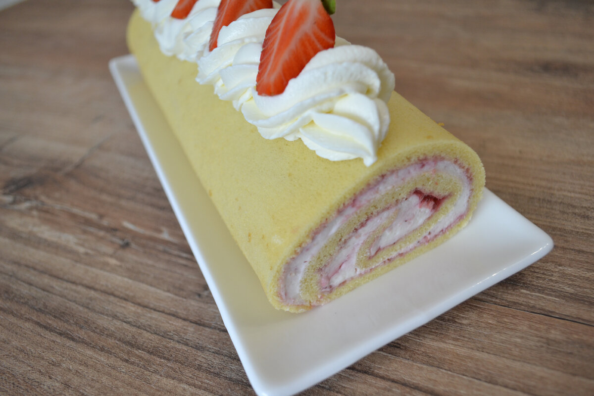 На мой взгляд рулет - это очень летняя выпечка. Во-первых он готовится в разы проще чем торт, но при этом не уступает ему по вкусовым качествам. А во-вторых обилие ягод летом делает такую выпечку очень доступной. Я использовала в начинку клубнику, но можно взять любые ягоды, например, мне очень нравится такой рулет с малиной. Бисквит: Яйца взбиваем в пышную пену, всыпаем постепенно весь сахар, не переставая взбивать. Взбиваем на высокой скорости миксера добиваясь плотной, пышной, устойчивой консистенции. Далее добавляем размягченное сливочное масло и молоко, добиваемся однородности и выключаем. Миксер нам больше не понадобится. Муку, разрыхлитель и соль перемешиваем между собой и в один прием всыпаем к взбитым яйцам. Венчиком, аккуратными движениями снизу-вверх, замешиваем тесто без комочков, стараясь не сильно осадить воздушную структуру. Выливаем и разравниваем тесто на противне, застеленным бумагой для выпечки. Выпекаем 15 минут при 180 градусах. Время выпечки примерное, зависит от