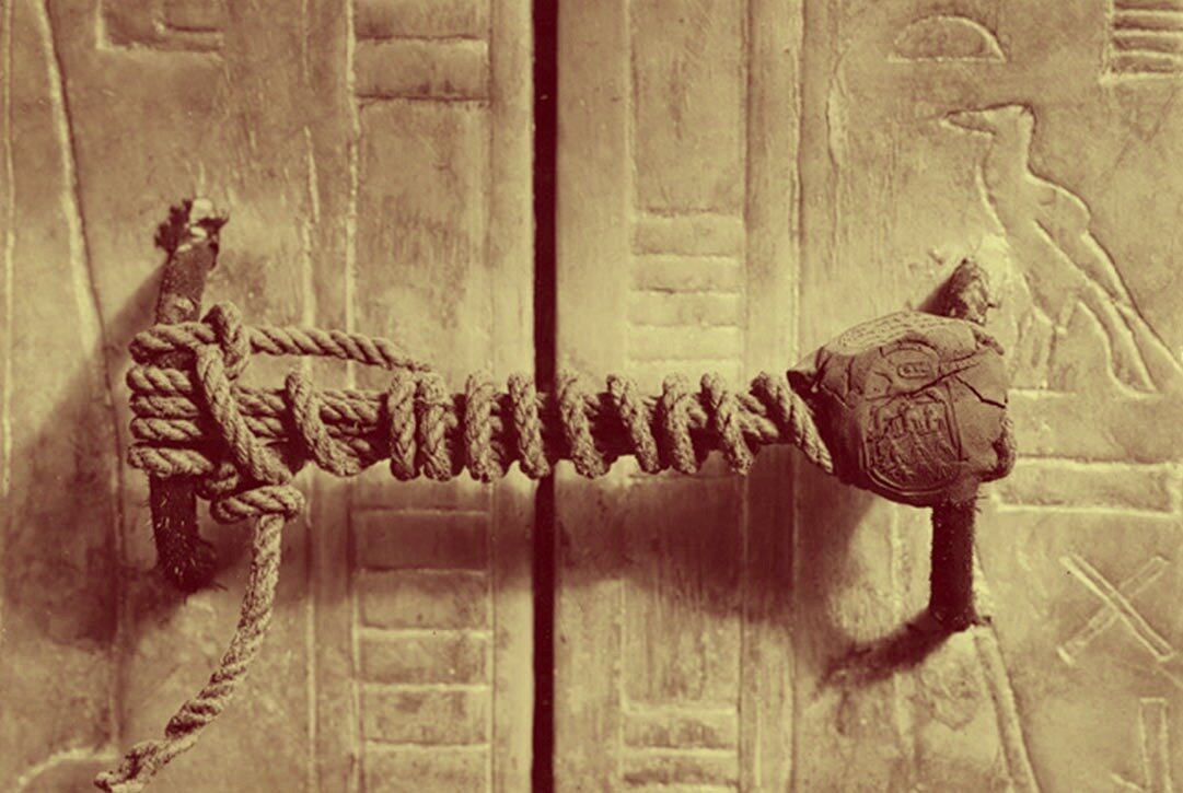 Верхнее изображение: Несломленная печать на гробнице Тутанхамона, 1922 год. (Wikimedia Commons).