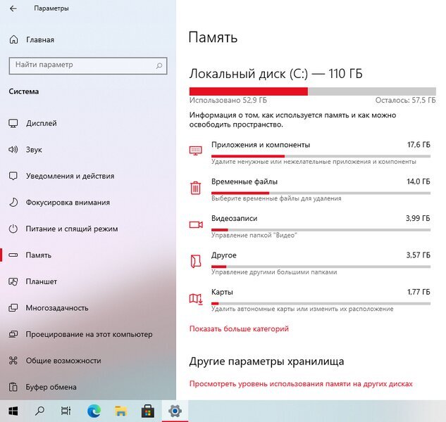 Для масштабной очистки лучше использовать одноимённую системную утилиту «Очистка диска»: в Windows 10 она доступна в приложении «Параметры» («Система» → «Память»), в более ранних версиях Windows — через меню «Свойства» при нажатии правой кнопкой мыши на используемый диск в «Проводнике». Самые объёмные файлы находятся в категории «Временные файлы». Это предыдущие установки Windows, файлы журнала обновления, файлы оптимизации доставки, интернет-файлы, диагностические данные и прочее. В совокупности их удаление поможет освободить десятки гигабайт, поэтому рекомендуется чаще проверять, сколько всего накопилось за последние несколько месяцев, и своевременно удалять весь мусор.