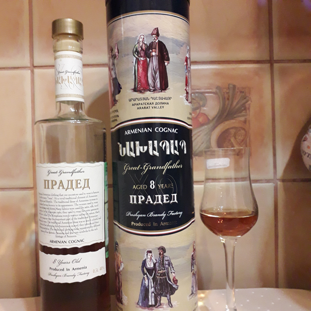 Всем привет, мои подписчики и читатели! Продолжаем знакомство с армянскими коньяками. Сегодня наш гость - коньяк Прадед 8 лет. Производитель - Прошянский Коньячный Завод. Прошянский Коньячный Завод - это современный производственный комплекс, оснащенный новейшим технологическим оборудованием. Производственные площади компании занимают территорию в 35 тысяч м² и имеют широкий спектр алкогольных напитков: коньяк, вино, водка, игристое вино, ликёр (подробнее - на официальном сайте завода). Коньяк Прадед 8 лет — восьмилетний коньяк, прошедший дозревание в бочонках из карабахского черного дуба. Он обладает мягким и бархатистым вкусом, отлично гармонирующим с ароматом. Напиток упакован в оригинальную подарочную тубу, украшенную изображениями старинных армянских костюмов. Оригинальная упаковка, элегантный вкус и благородный глубокий цвет делают коньяк "Прадед" ХО 8-летний украшением любой коллекции и стильным выбором для подарка близкому человеку или другу. Итоги дегустации перед Вами: Цвет: