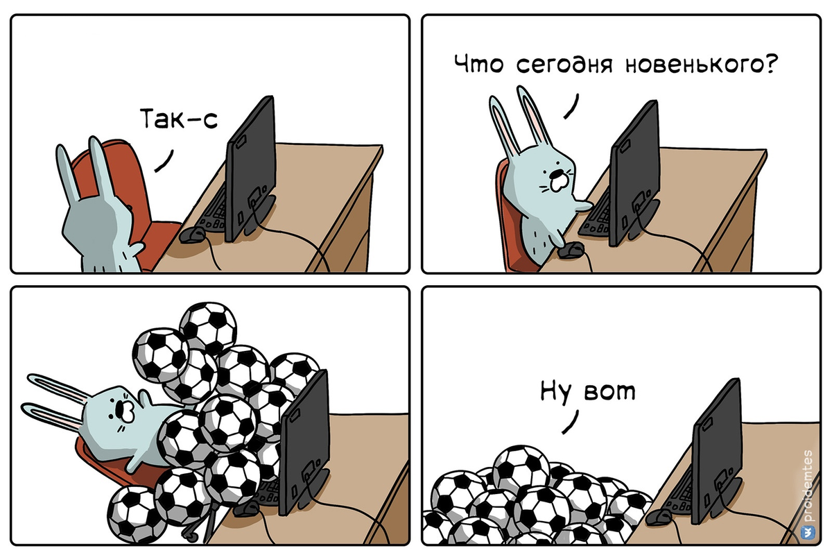 Футбольная тематика в данный момент как никогда актуальна, ведь прямо сейчас проходит Чемпионат Европы по футболу UEFA EURO 2020 и миллионы футбольных фанатов следят за успехами любимых сборных. Признаюсь честно, сам я от футбольной тематики довольно далек - чемпионаты давно не смотрю, в Фифу на приставке не играю, да и сам в футбол играл в последний раз в детстве. Но, вполне возможно, что эта тема будет интересна какой-то части моих подписчиков, поэтому сегодня я решил собрать для вас десятку смешных зарисовок о футболе от самых разных авторов - как российских, так и зарубежных. Надеюсь, что вам понравится! Пожалуй, начнем мы эту подборку с универсального комикса за авторством российского художника под псевдонимом Гражданин Пройдемтес. Актуально во время любого крупного футбольного чемпионата. Авторы датского юмористического веб-комикса Wumo - сценарист Майкл Вульфф (Mikael Wulff) и художник Андерс Моргенталер (Anders Morgenthaler) - в одной из своих многочисленных однокадровых зарисо