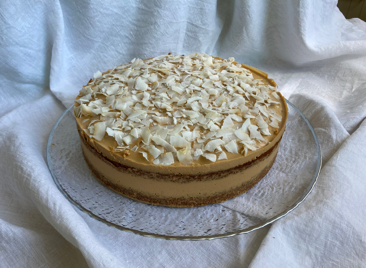 А меня обычно вдохновение покидает как раз на этом этапе, когда от собственно приготовления нужно переходить к декору. Поэтому я покрываю начинкой и верхний корж. А чтоб он не выглядел уж так совсем сиротливо, посыпаю его чем бог послал. На этот раз бог послал мне кокосовую стружку - радуюсь, мне нравится, как это выглядит!