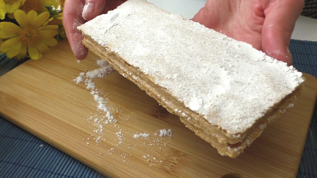 Хрустящие нежные коржи и мягкая ароматная прослойка, дополняются лёгкими штрихами сахарной пудры. Это так вкусно, что не передать словами. Это нужно попробовать каждому...