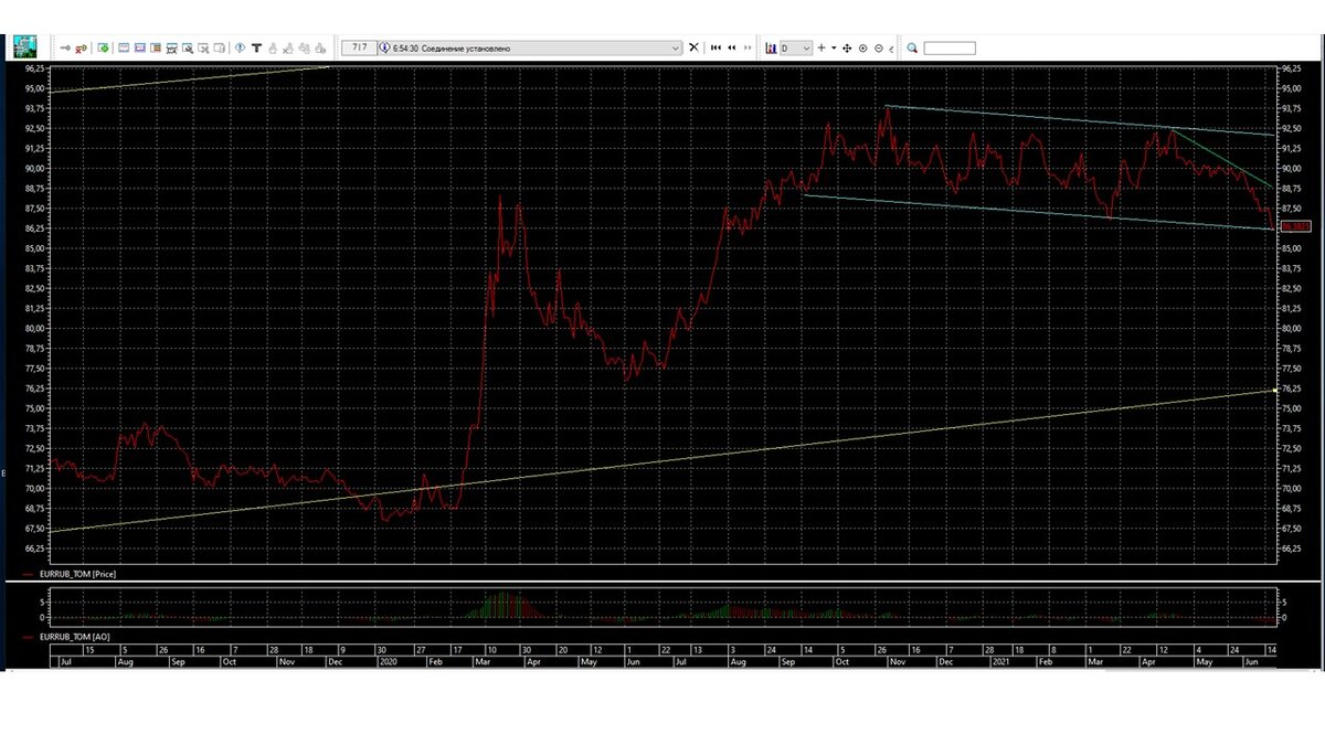 В последний торговый день 18 июня 2021 года валютная пара евро/рубль закрылась на уровне 86,3825. Теперь перед Министерством финансов РФ и Центральным банком РФ возникает вопрос продолжать наблюдать за движение вниз валютной пары или пора остановить просадку начинать выкупать валюту на рынке, чтобы остановить просадку. Скорее всего пробные шаги увидим на новой неделе, если в середине недели закрепиться выше уровня 87,65, появляется возможность к пятнице выйти на новую вершину 89,7. Поэтому рассмотрим несколько сценариев ожидаемые в движение евро/руль на новой неделе. Сценарий 1. Валютная пара евро/рубль с открытия торгов на биржевой площадке начинает разгоняться. Медведи на уровне 86,53 могут уже начать сбивать темп роста валютной пары даже может получится вернуть назад. Давление быков может оказаться упорным появится возможность выйти на уровень 87,2-87,7, если быкам получится к среде удержаться на указанных уровнях появляется возможность закрыть неделю на новом уровне 89,7-90,2. Сце