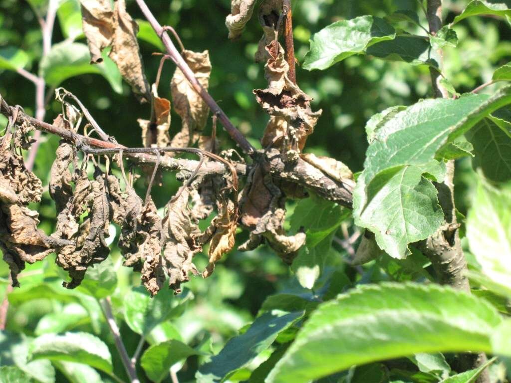 Причиной усыхания побегов может стать одно из опаснейших заболеваний плодовых деревьев - плодовая гниль (монилиоз). Это грибковое заболевание, которое легко перемещается по всему саду при помощи ветра и насекомых. За короткий срок способно уничтожить весь урожай. Сначала заболевают плоды, наверняка вы видели пораженные плоды на своих деревьях. Из плодов гриб проникает в побеги и живет в них. Весной гриб активизируется и в июне-июле начинается усыхание концов побегов(особенно подвержены этому заболеванию яблони).