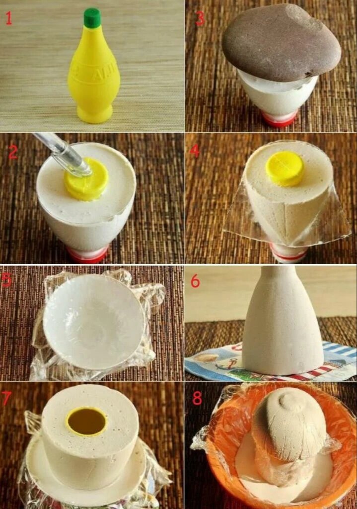 Для изготовления шляпки поделки из гипса своими руками для дачи необходимо подобрать чашку или пиалу соответствующего размера. Внутри ее застилают пищевой пленкой, при этом заломов и складок быть не должно, иначе они отпечатаются на поверхности.