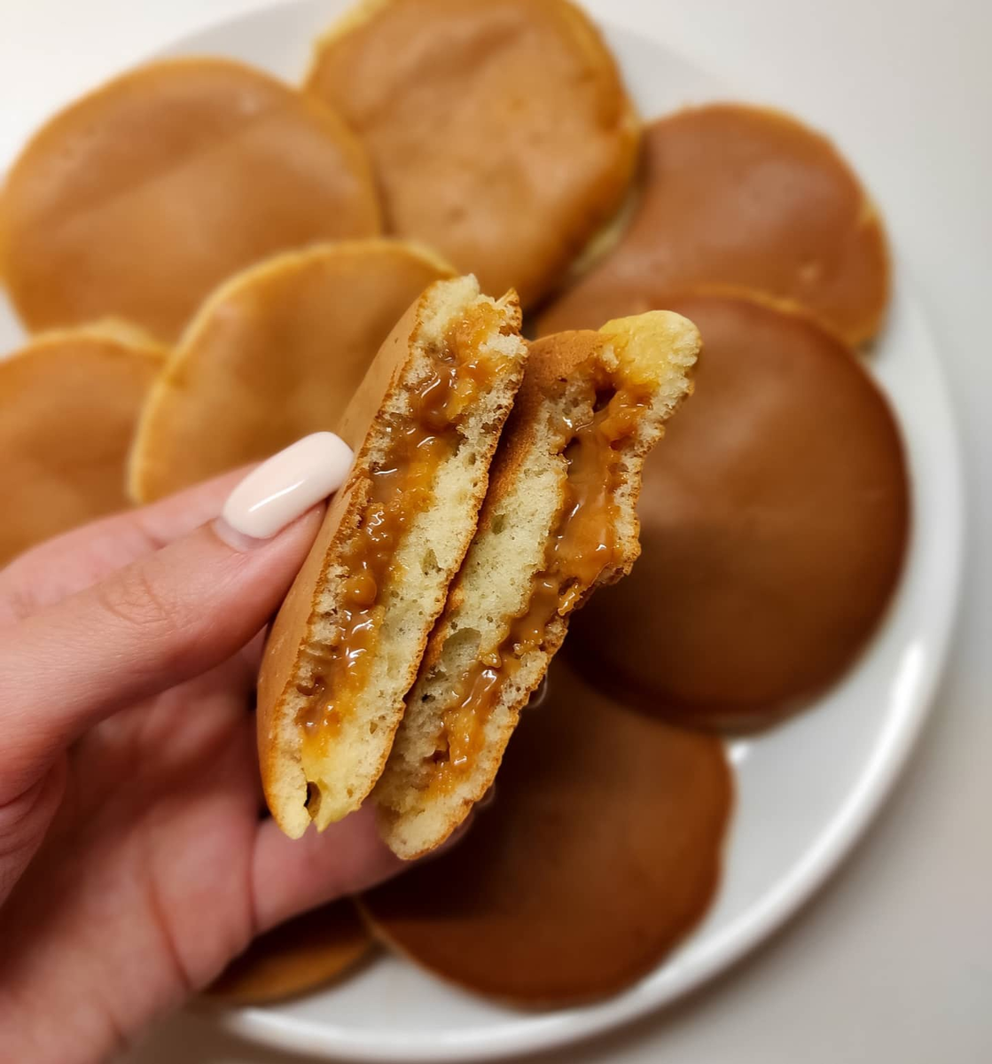 🍯 Оладушек аккуратно разрезать вдоль. Одну часть смазать варёной сгущёнкой, накрыть второй частью и пальчиками заклеить края