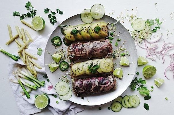 Ингредиенты: Для соуса: • 2 чашки кешью, замоченного на ночь • ½ чашки жидкости, оставленной после замачивания кешью • 3 столовые ложки лимонного сока • 2 чайные ложки соли • 1 зубчик чеснока • 1 чашка кинзы • ½ небольшой луковицы Для капустного салата: • 2 чашки красной капусты, нашинкованной • 1 столовая ложка оливкового масла • 1 столовая ложка рисового уксуса • 1 столовая ложка черного кунжута Для роллов: • 1 упаковка рисовой бумаги для спринг роллов • ½ красного лука, нарезанного • ½ перца халапеньо, нарезанного (или другого острого) • ½ чашки листьев кинзы • 1 огурец, нарезанный • 1 чашка проростков • ¼ чашки зеленого лука, порубленного • зеленый горошек, по вкусу • 1 авокадо, нарезанное Инструкции: 1. Приготовить соус, смешав все ингредиенты в блендере до однородности. 2. Приготовить салат, смешав все ингредиенты в миске. 3. Смочить рисовую бумагу в теплой воде, переложить на поверхность и выложить в центре листа в любой по