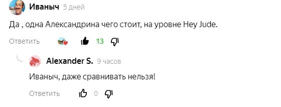 При этом, когда кто-нибудь из комментаторов скромно заговаривает о том, что вообще-то Битлз слушали во всем мире, и слушают до сих пор, а Песняры мало известны за пределами СССР, на него начинают выливать ушаты грязи и нещадно минусовать.