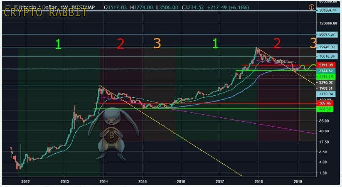Добрый день, уважаемые трейдеры✌️ Сегодня хочу поделиться с вами очень полезной информации о циклах BTC На графике отражены три периода: 1. Зеленый - рост (110 недель) 2. Красный - падение (58 недель) 3. Оранжевый - боковое движение (40 недель) Интересным наблюдением нам показался тот факт, что временные периоды повторяются с точностью до недели. Ниже приведены временные и количественные характеристики этих периодов, которые удивительным образом имеют сходство: 1. Цикл 24 окт 2011 – 25 нояб 2013 110 недель (770 дней) цена битка выросла с 2$ до 1150$ рост составил 50000% 2. Цикл 2 декабря 2013 – 12 января 2015 58 недель (406 дней) Цена битка упала с 1150$ до 150$ падение составило 87% 3. Цикл 19 января 2015 – 26 окт 2015 40 недель (280 дней) Цена биткоина колебалась в коридоре цен: 200$ - 300$ Наблюдалось 50% рост от нижней границы и 30% откат от верхней границы коридора. 1.Цикл 9 ноября 2015 – 11 декабря 2017 110 недель (770 дней) Цена биткоина выросла с 300$ до 20 000$ Рост составил