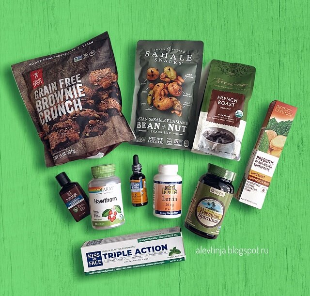 Всем привет! В этом заказе у меня собрались самые востребованные добавки - лютеин, боярышник, мелисса и спирулина. Все из них я принимаю практически ежедневно. К ним в компанию закинула парочку зубных паст, кое-какие вкусности, да пробник шампуня. Два товара купила повторно, всё остальное - впервые. Напоминаю, что на ВЕСЬ заказ действует скидка 20% по промокоду KAMENSKIX (действие которого может закончиться в любой момент, успевайте!) Итак, заказала - получила: 💚 Caveman Foods, Grain Free Brownie Crunch, 14 oz ( 397 g) Очень вкусные кранчи со вкусом брауниз. Они без зерна, а значит и без глютена. Нереально остановиться от их поедания. Недостаток один - достаточно высокий ценник 💚 Sahale Snacks, Snack Mix, Asian Sesame Edamame Bean + Nut, 4 oz (113 g) Купила ещё один вариант несладких снеков от любимого производителя. Тут у нас, помимо орешков, имеются бобы, чечевица, нут, кунжут и т.п. Должно быть вкусно! 💚 Teeccino, Chicory Herbal Coffee, Organic French Roast, Dark Roast