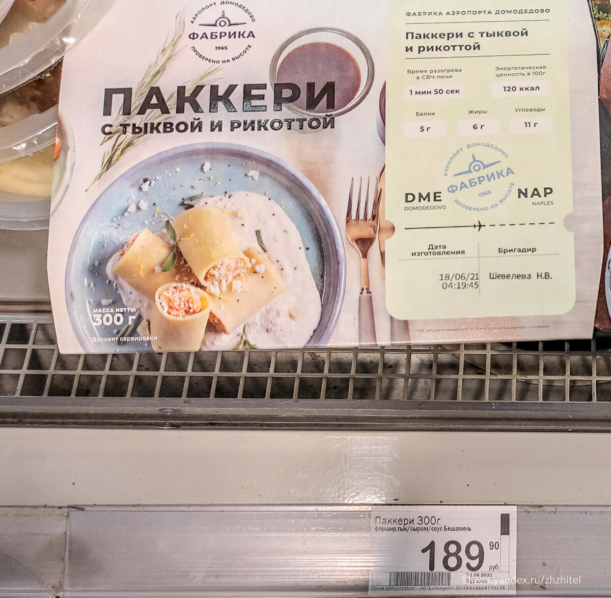 С недавних пор продукцию фабрики бортового питания аэропорта Домодедово можно купить в супермаркетах. Наша семья периодически покупает и тестирует новинки. На этот раз мы купили на пробу «Паккери с тыквой и рикоттой». Паккери с тыквой и рикоттой куплено в «Перекрёстке» за 189,90 рублей. Изготовителем и поставщиком является фабрика бортового питания. Блюда поставляются в фирменной упаковке с эмблемой фабрики. На лицевой стороне слева изображено блюдо, правая часть стилизована под посадочный талон, где указана основная информация. Обратите внимание, что коды аэропортов обозначают изготовителя и регион, представленный блюдом. DME → NAP — это Домодедово и Неаполь. На оборотной стороне размещена подробная информация о блюде, составе и приведена история блюда: Паккери - это традиционная неаполитанская паста с очень интересной историей.