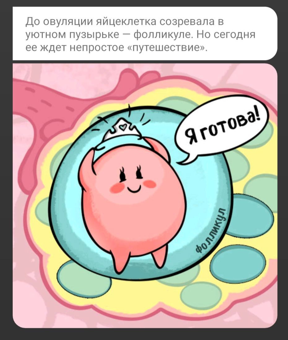 Овуляция Название процесса происходит от латинского слова «яйцо», то есть в прямом смысле, высиживание. В данном случае, яйцеклетки, без которой, как известно, дети не появляются. Рассмотрим поближе. Процесс регулируется сложной системой гормонов, а штаб-квартира располагается в древнейших структурах мозга и носит название гипоталамо-гипофизарной нейроэндокринной регулирующей системы. Пока всякие службы нервно курят от зависти к столь пафосному имени, система выполняет свою работу: вырабатывает особые гормоны, которые сообщают другим железам организма, что пришла пора готовиться к размножению, ибо часики тикают. Окей, отвечает организм, и пускает в рост один из ооцитов. Процесс занимает от 20 до 35 дней, в зависимости от длительности цикла, а когда яйцеклетка полностью созревает, происходит, собственно, овуляция, то есть выход яйцеклетки из яичника, после чего её захватывает маточная труба. Там готовая к продолжению рода клетка ждёт, когда до неё доберутся сперматозоиды. Ждать я