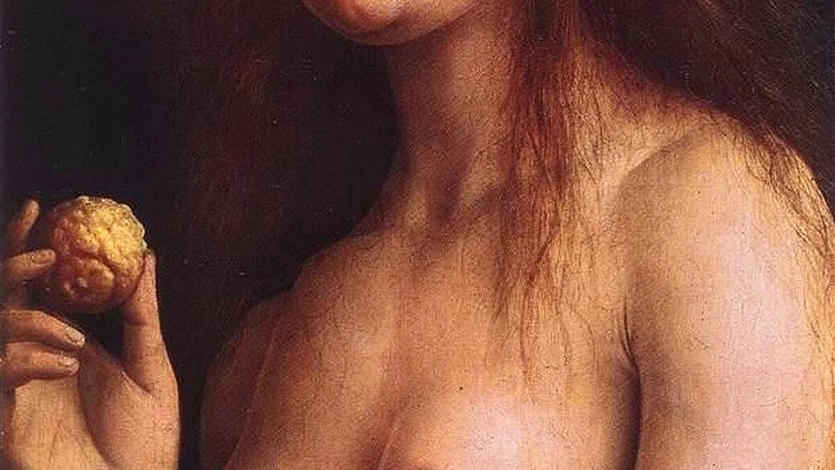 Присмотритесь к фрукту, который балансирует на кончиках мрачных пальцев Евы, и станет ясно, что он не был укушен. Однако менее ясно, что это за фрукт на самом деле. Слишком маленькое и ухабистое, чтобы быть яблоком, это любопытное блюдо не похоже ни на гранат, ни на инжир, ни на грушу, каждая из которых была проверена библеистами как возможные кандидаты на запретный плод. В 1976 году средневековый ученый Джеймс Снайдер привел неопровержимые аргументы в пользу того, что этот фрукт является «отдельным сортом цитрусовых», объяснив, что «хотя первоначальное название уже не является привычным, оно было хорошо известно в 15 веке и могло быть наиболее подходящий пример во времена Ван Эйка экзотических плодов Рая, которые Ева предложила своему мужу: цитрусовых, известных как «Адамово яблоко». Среди наблюдателей еврейского праздника Суккот (Праздник Кущей), более широко известный сегодня как цитрон - или «этрог», фрукт церемониально развевается в связке, содержащей ветвь финиковой пальмы, ветвь мирта и т. Д. и ветвь ивы. Считается, что цитрон / этрог является ранним предшественником многих сортов цитрусовых, которыми мы наслаждаемся сегодня, до гибридизации.