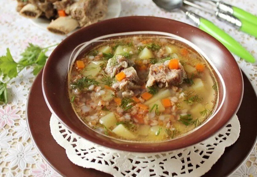 Готовое мясо вынуть из бульона и нарезать кубиками. Бульон процедить, довести до кипения и всыпать гречку. Добавить обжаренные овощи, картофель и мясо. Варить до готовности. Затем добавить нарубленный чеснок, накрыть крышкой и оставить на 15 минут.