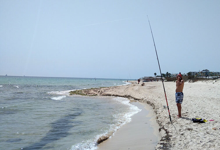 Разбавляю пляжный отдых любимым увлечением В очередной раз выбравшись отдохнуть с семьёй на дальний юг, пусть и не надолго, я не забыл о своём любимом увлечении, и взял с собой рыболовные снасти. Помимо пляжного времяпрепровождения и различных экскурсий, всегда стараюсь в таких поездках половить местную рыбку. Информации о рыбалке в Сусе я нашел совсем немного, но, общее представление получил. Поплавочная снасть тут не особо популярна, спиннингом вообще никто почти не ловит, главный способ у местных – донка. Дело в том, что в Сусе, в основном, песчаные пляжи с пологим дном, и потому закидывать лучше подальше. По представлениям местных. Они даже для заброса заходят почти по пояс в воду. Снасть простая – удилище, чаще всего мощное, до 4 метров, на катушке намотана толстая монофильная леска, грузило до 100 грамм, крючки на поводках от двух и больше, монтаж – кто во что горазд. Насадка – морской червь. Ловят, чаще всего, морского карася – ласкиря, и ему подобных. Размеры, я плакал – от лад