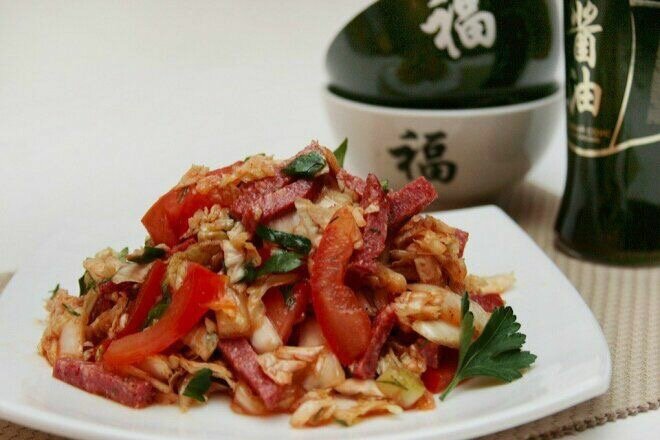 Салат из пекинской капусты и колбасы с паприкой Ингредиенты: капуста пекинская 1кочан колбаса полукопченая 150-200г помидоры 1шт. масло оливковое 3-4ст.л. соус соевый 2-3ст.л. паприка молотая по вкусу зелень по вкусу перец черный молотый по вкусу соль по вкусу Приготовление: Заправить салат из пекинской капусты и колбасы с паприкой оливковым маслом. Добавить зелень, размешать.