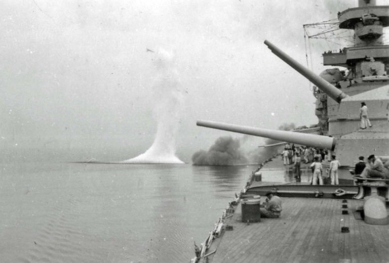 German Scharnhorst battleship of the Nazi Kriegsmarine in a military campaign. View from the deck to a sea battle against an American transport ship.