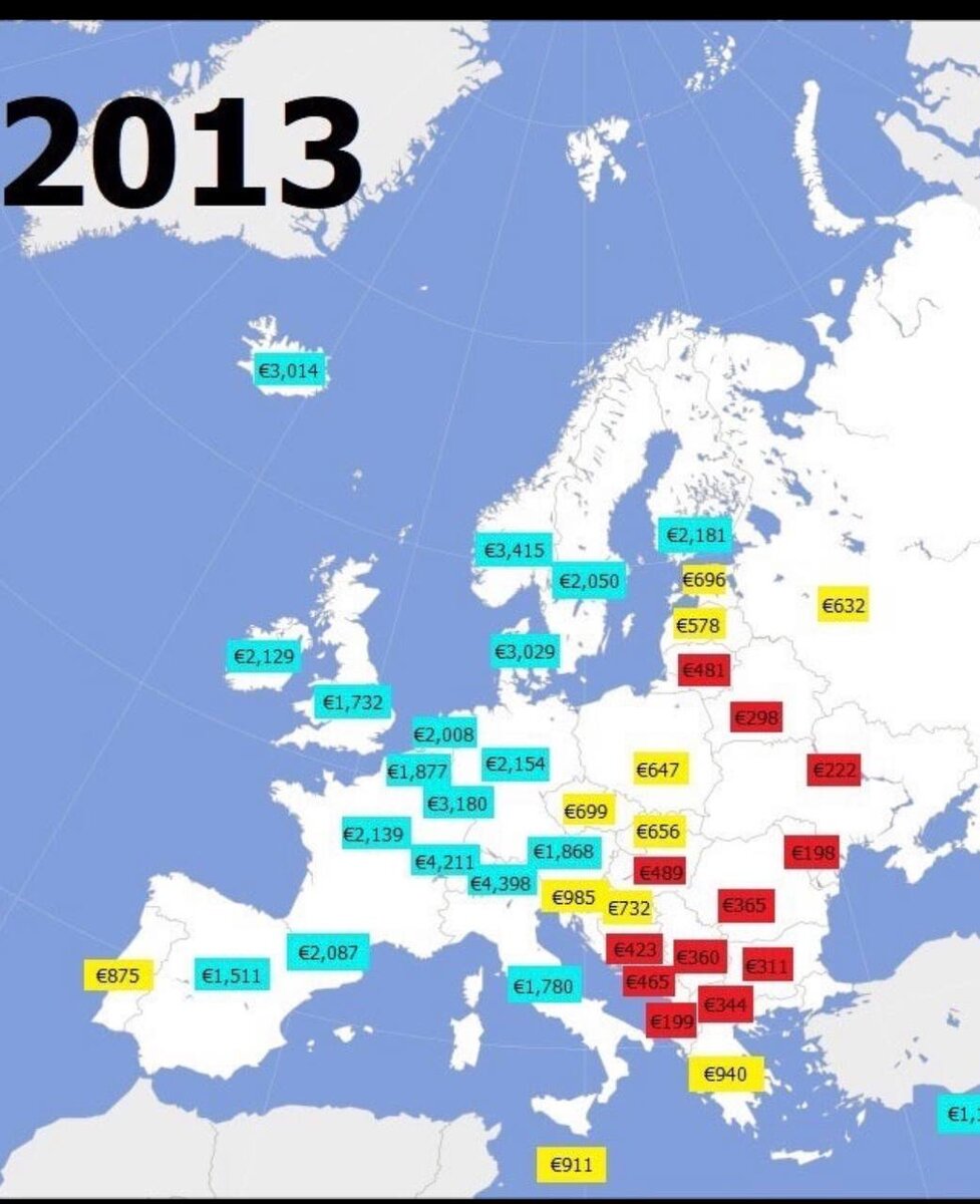 Недавно увидел такую картинку на просторах Интернета: средняя зарплата в европейских странах после налогов.