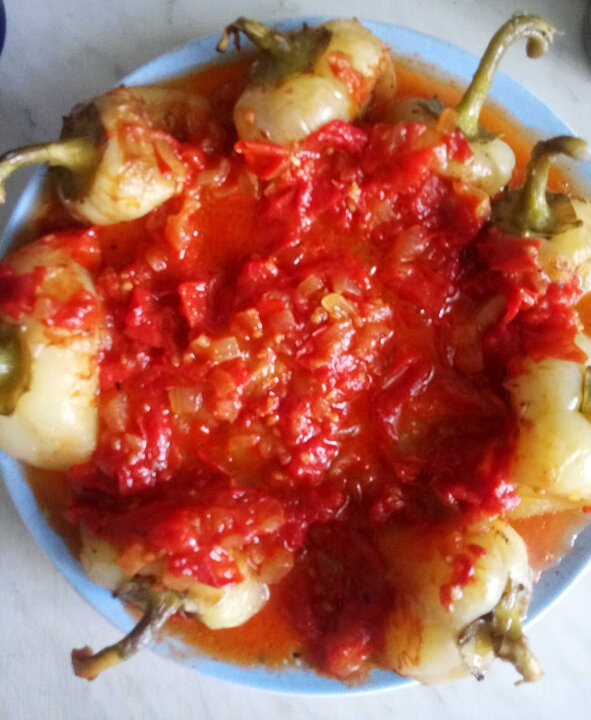Болгарский перец переложить в сковороду с томатным соусом. Тушить всё вместе под крышкой несколько минут и снять с огня.