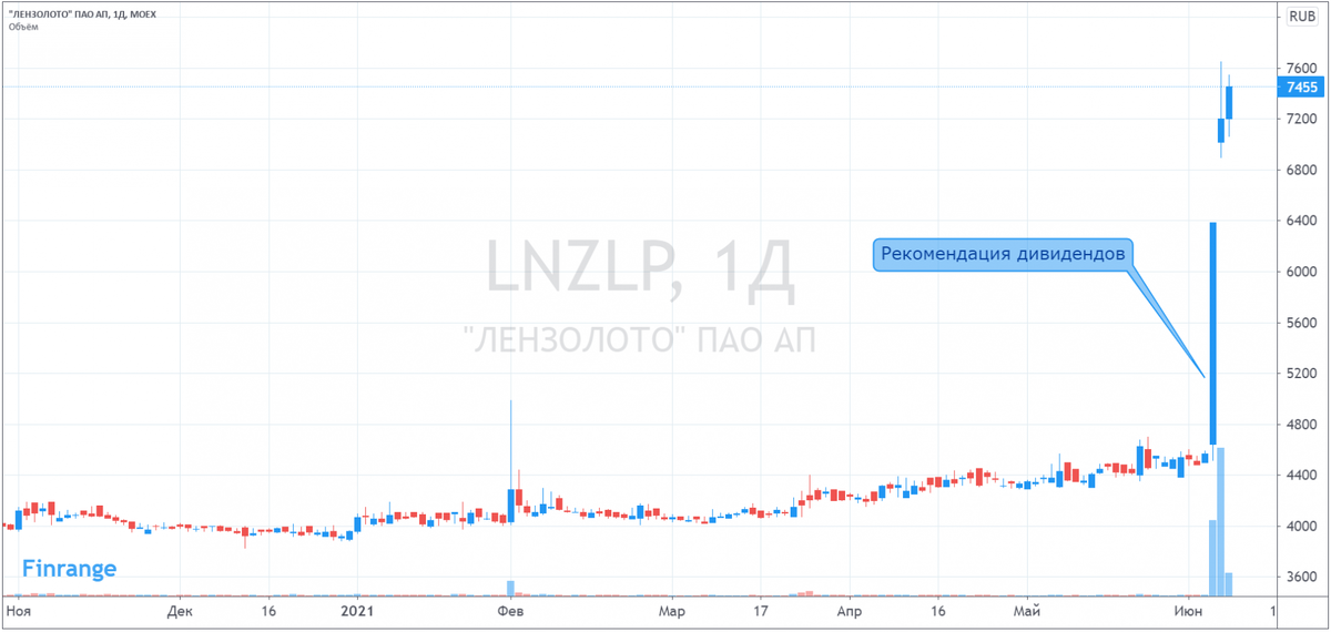 В прошлую пятницу обыкновенные и привилегированные акции Лензолото выросли более чем на 40% на рекомендации дивидендов. Совет директоров Лензолото рекомендовал дивиденды за 2020 г. в размере 15219,50 руб. на одну обыкновенную акцию и 3699,27 руб. на «префы». Текущая дивидендная доходность по всем акциям составляет больше 40%. Дата закрытия реестра для получения дивидендов назначена 13 июля 2021 г. На этой неделе вертикальный рост акций Лензолото продолжился. В очередной раз инвесторы увидели «космические дивиденды» и бросились скупать ценные бумаги. Рекордные, но разовые дивиденды Центрального телеграфа ничему не научили!? Напомним, 29 июня 2020 г. акции Центрального телеграфа с открытия выросли более чем на 40% на рекомендации о дивидендах. Совет директоров рекомендовал за 2019 г. дивиденды в размере 11,83 руб. на оба типа акций. Текущая дивидендная доходность на тот момент по обыкновенным акциям составляла 53%, по «префам» - 63%. Закрытие реестра для получения дивидендов было заплани