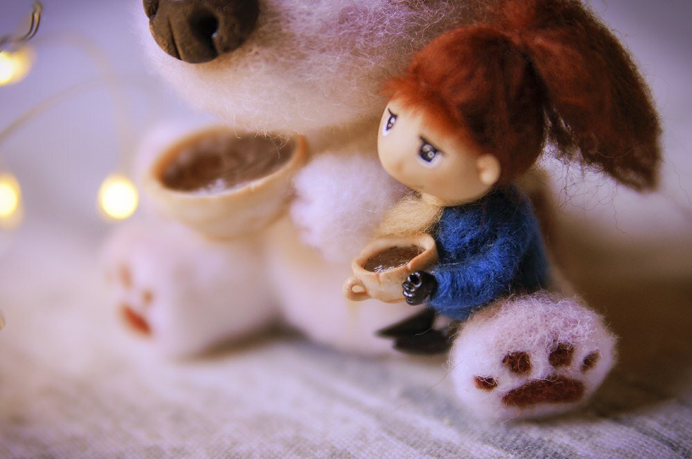 В итоге у меня получилась вот такая парочка, которая мирно беседует за чашечкой кофе (как я делала чашки эти - история тоже забавная). Маленький человек сидит, прижавшись к большой собаке, как к верному другу, его совсем не смущает разница в размерах и то, что пушистый товарищ оказался на месте хозяина.