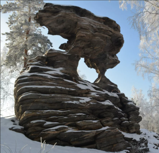 Скала Крылья Дракона как будто оплавлена. Находится на одной линии со стеной из мегалитов Аракульский Шихан.