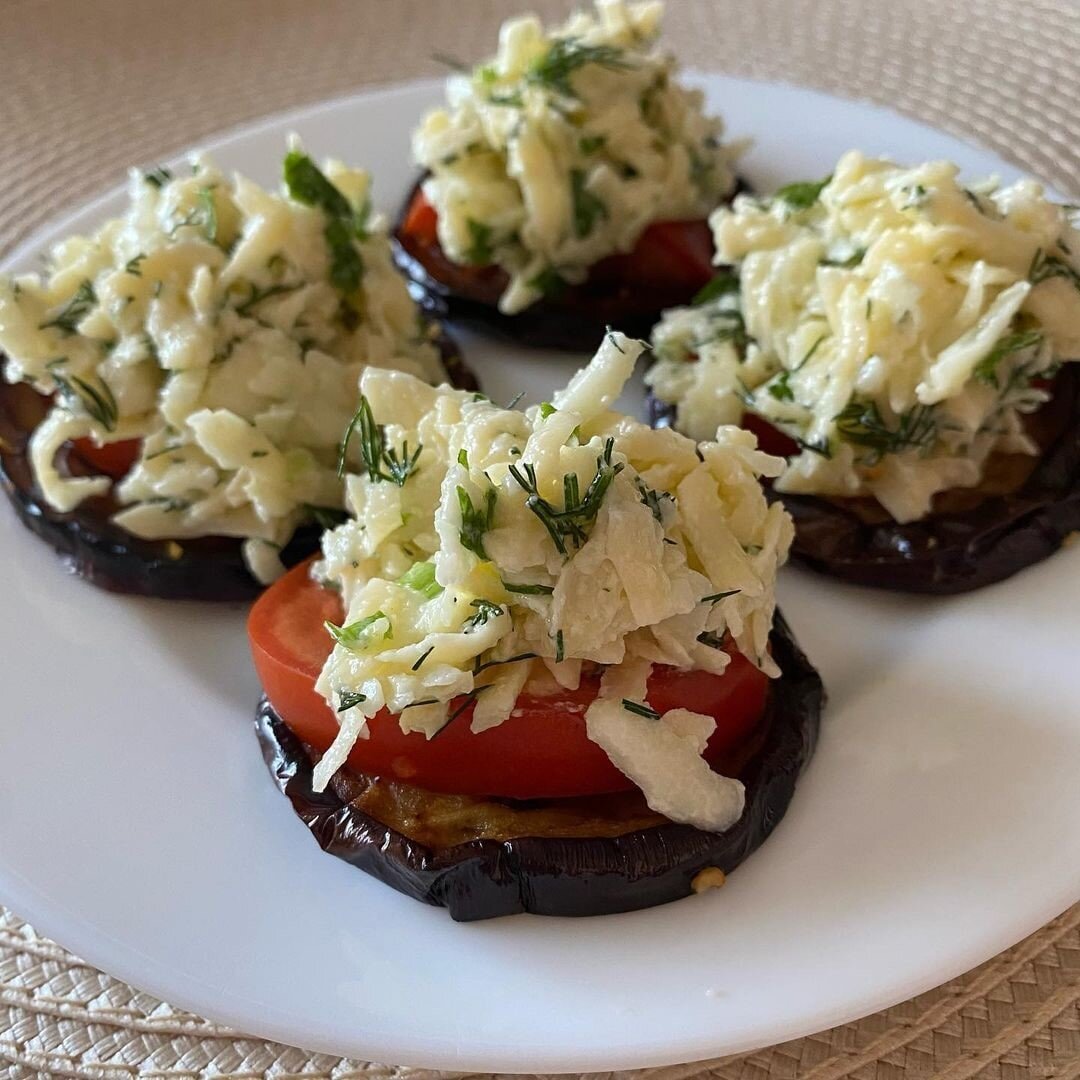 ЗАКУСКА ИЗ БАКЛАЖАНОВ Ингредиенты: 🔹1 баклажан; 🔹1 помидор; 🔹150 гр твёрдого сыра; 🔹30 гр домашнего майонеза + 30 гр сметаны 25-30%; 🔹1-2 зубчика чеснока; 🔹зелень по вкусу. Приготовление: 1️ Баклажаны нарезала, посолила и оставила на 30 минут, чтобы вышла горечь. Затем сполоснула и обсушила салфетками. 2️ Кружочки баклажанов обжарила на кокосовом масле. Остудила на салфетках, чтобы лишнее масло вышло. 3️ Помидоры нарезала полукольцами. 4️ Сыр натерла на мелкой терке. Добавила 50/50 сметану, майонез и чеснок. Формируем закуску. 🍆 Баклажан, 🍅помидор, 🧀сырная закуска.
